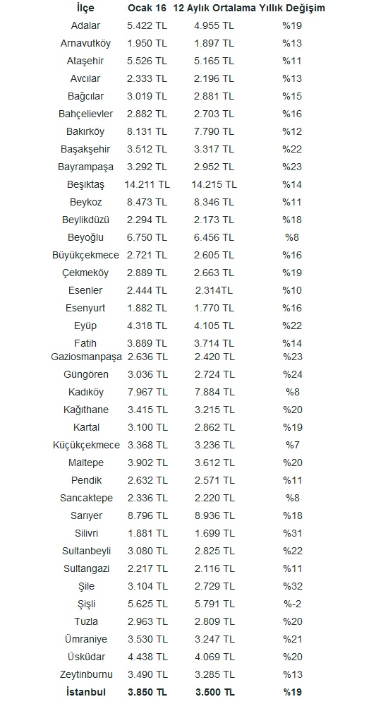 Açıklanan 2016 Nisan ayı Emlak Endeksi raporuna göre, İstanbul'da konut fiyatları artış gösterdi. Bu raporda İstanbul'un ilçe ilçe konut fiyatlarıda paylaşıldı.