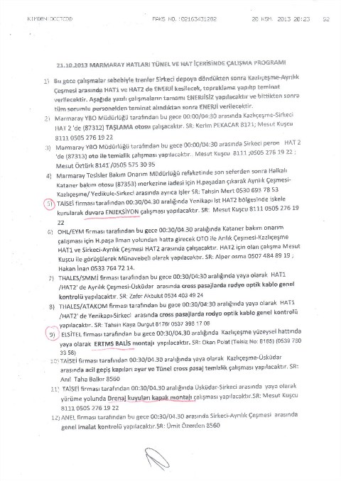 Hakan Gülseven'in haberine göre; "20 Kasım 2013 tarihli ve Marmaray Koordinasyon Kurulu Başkanı Metin Akbaş imzalı görev talimatında, Sirkeci İstasyonu’nda su kaçağı olduğu ve bunun onarılması için çalışma yürütüleceği belirtiliyor. Hat boyunca inşaat ve onarım çalışmalarının gece seferler sona erdikten sonra devam ettiğini ortaya koyan görev talimatnamesinde, Yenikapı istasyonunda duvara enjeksiyon çalışması yapılacağı, Kazlıçeşme’de ‘ERTMS’ olarak adlandırılan otomasyon sisteminin montajı yapılacağı belirtiliyor.