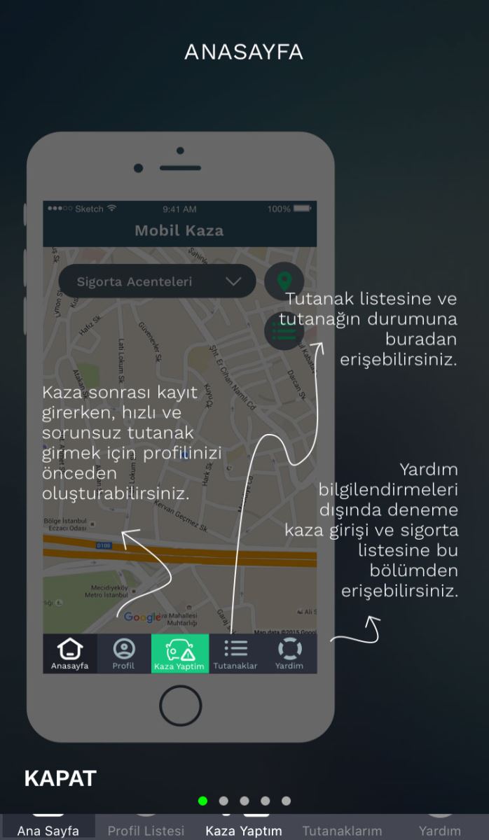 Sistemi kullanmak çok kolay. Android ya da IOS yazılımlı telefonların uygulama mağazasından ‘Mobil Kaza Tutanağı’ yazıp aratınca uygulama çıkıyor. Uygulamayı yüklemeniz yeterli. Bu uygulamayla formda olduğu gibi poliçe ve araç bilgilerini (şasi numarası, model gibi) tek tek girmenize gerek kalmıyor. Ayrıca tutanağı tek bir telefonda tutmak da yeterli. Poliçenin üzerindeki kare kodu okuttuğunuzda tüm bilgiler otomatik çıkıyor. İşlem 5 dakika sürüyor.