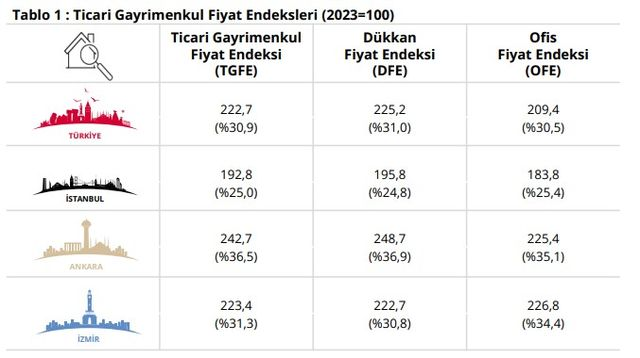 Türkiye genelinde, 2025 yılı dördüncü çeyreğinde bir önceki çeyreğe göre yüzde 8,5 oranında artan Dükkan Fiyat Endeksi, bir önceki yılın aynı çeyreğine göre nominal olarak yüzde 31,0 oranında arttı, reel olarak ise yüzde 0,5 oranında azaldı. Aynı çeyrekte, bir önceki çeyreğe göre yüzde 5,7 oranında artan Ofis Fiyat Endeksi bir önceki yılın aynı çeyreğine göre nominal olarak yüzde 30,5 oranında artmış, reel olarak ise yüzde 0,8 oranında azaldı.