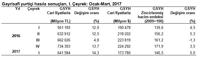 Üretim yöntemiyle gayrisafi yurtiçi hasıla tahmini, 2017 yılının birinci çeyreğinde cari fiyatlarla yüzde 14,3 artarak 641 milyar 584 milyon TL oldu.